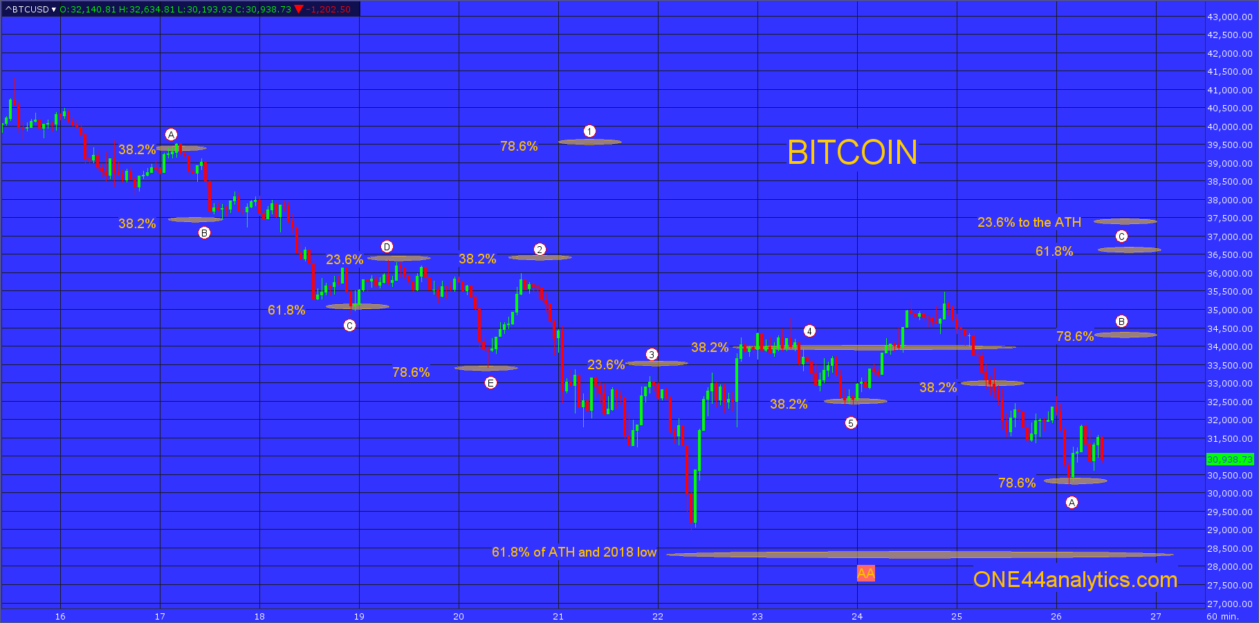 If no rally comes from 30,300 (A) look for new lows and 28,300, this is 61.8% of the ATH and the 2018 low, if this level gets taken out go to the long term view for the next target. Provided it rallies from 30,300 it will still need a close above 23.6% (C) back to the ATH to say a longer term bottom is in.