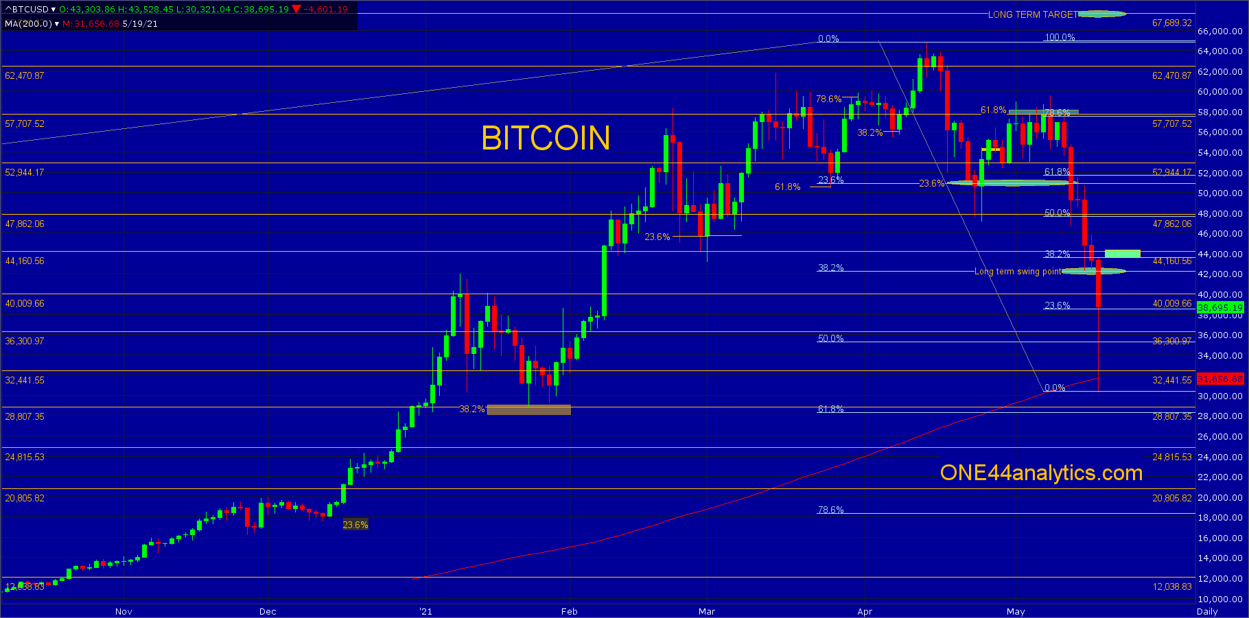 The initial rally after hitting our long term swing point of 42250 rallied $3000.00 and now they blew that level out, so now we have to take a look at all the key retracements levels. First of all 42250 was 38.2% back to the 2018 low and we know when using the ONE44 Fibonacci rules and guidelines, it needs to hold above 38.2% to keep the trend intact. It can have one close below, but the next day has to be back above it and get away from the area fast. Since they went so far below 42250 and closed below it we will now watch 38.2% back to the ATH to see if this rally is truly over for the time being. The level is 43600 and they need a close above it tomorrow to keep the trend positive. Failing to get above this level should send them to retest today's low and even 61.8% back to the 2018 low at 28300. Provided they can close above 43600 the first target is 52000, this is 61.8% back to the ATH.