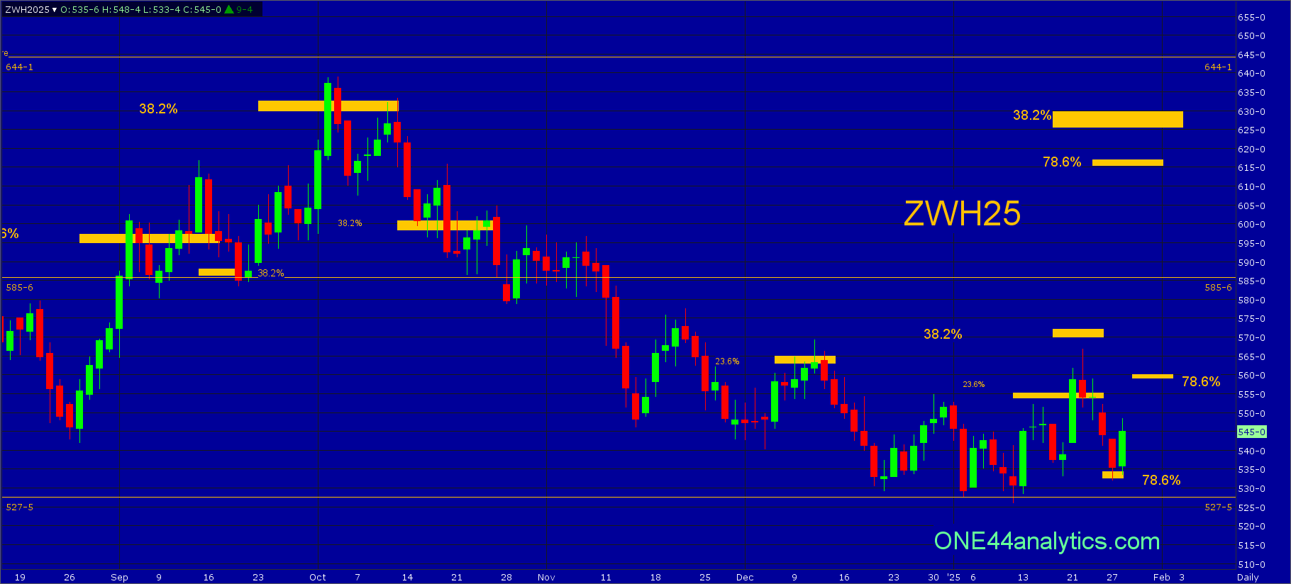 This brings us to Wheat, after failing to get above 38.2% at 570.00 on 1/22/25 a new low was the longer term target, however it held the short term target of 78.6% back to the 1/10/25 low at 534.00. Like Corn, a failure to make a new low in the area of a 78.6% retracement can be the start of the next bull move, or at least send it 78.6% of where it just came from. Provided the 534.00 level holds, the first target is 559.00 (78.6%) and we will now see if this is the bottom that turns into a longer term low, just like it did in Corn. When and if this market takes out 559.00 we will then watch the retracements below to see if the trend can continue as it did in both Soybeans and Corn. The short term target for May is 572.00 (78.6%).