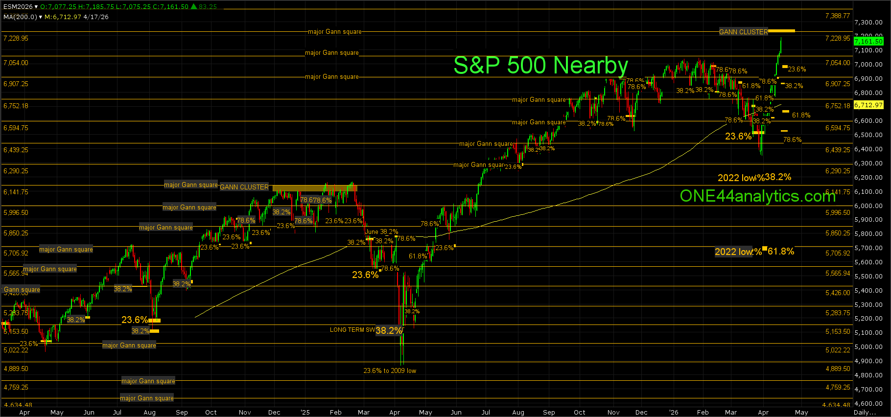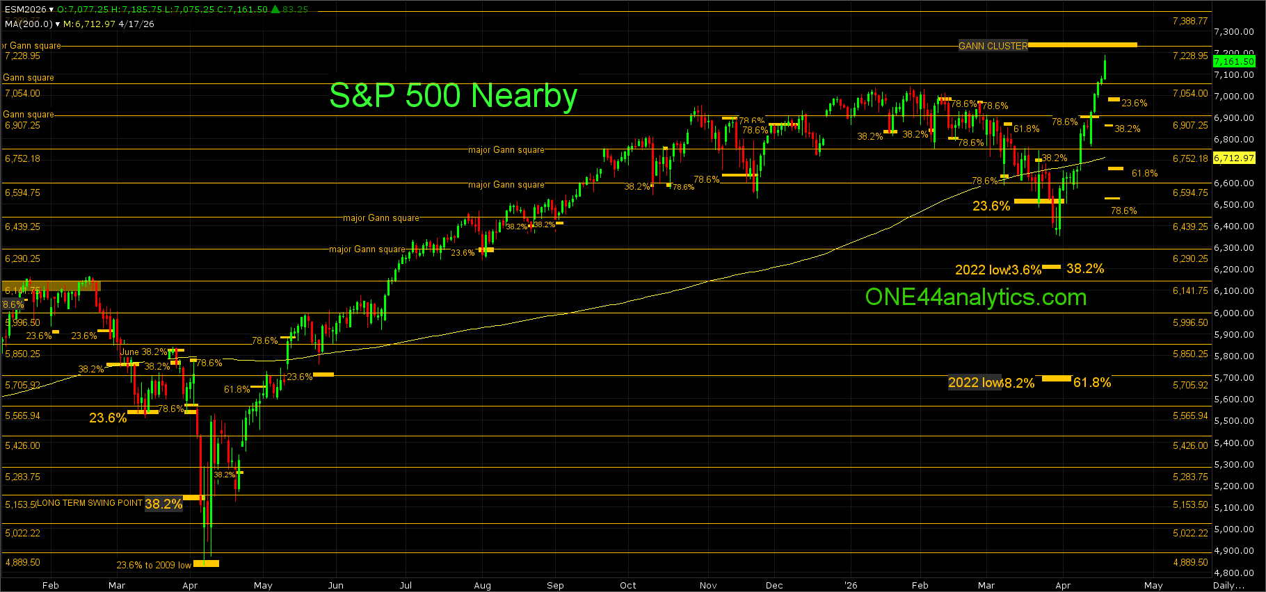 Can we get another big turn lower from this next cluster of major Gann squares is yet to be determined, as always it can have one close above it, but we do not want to see two in a row, or the level is violated and we keep looking for the next major Gann square. Provided there was a setback from this area we will watch the Fibonacci retracements below to see if short/longer term trend gets violated and gives us another reason for the market to go lower. The two key lows to use with the retracements are 3/31/26 and the 4/7/25 low