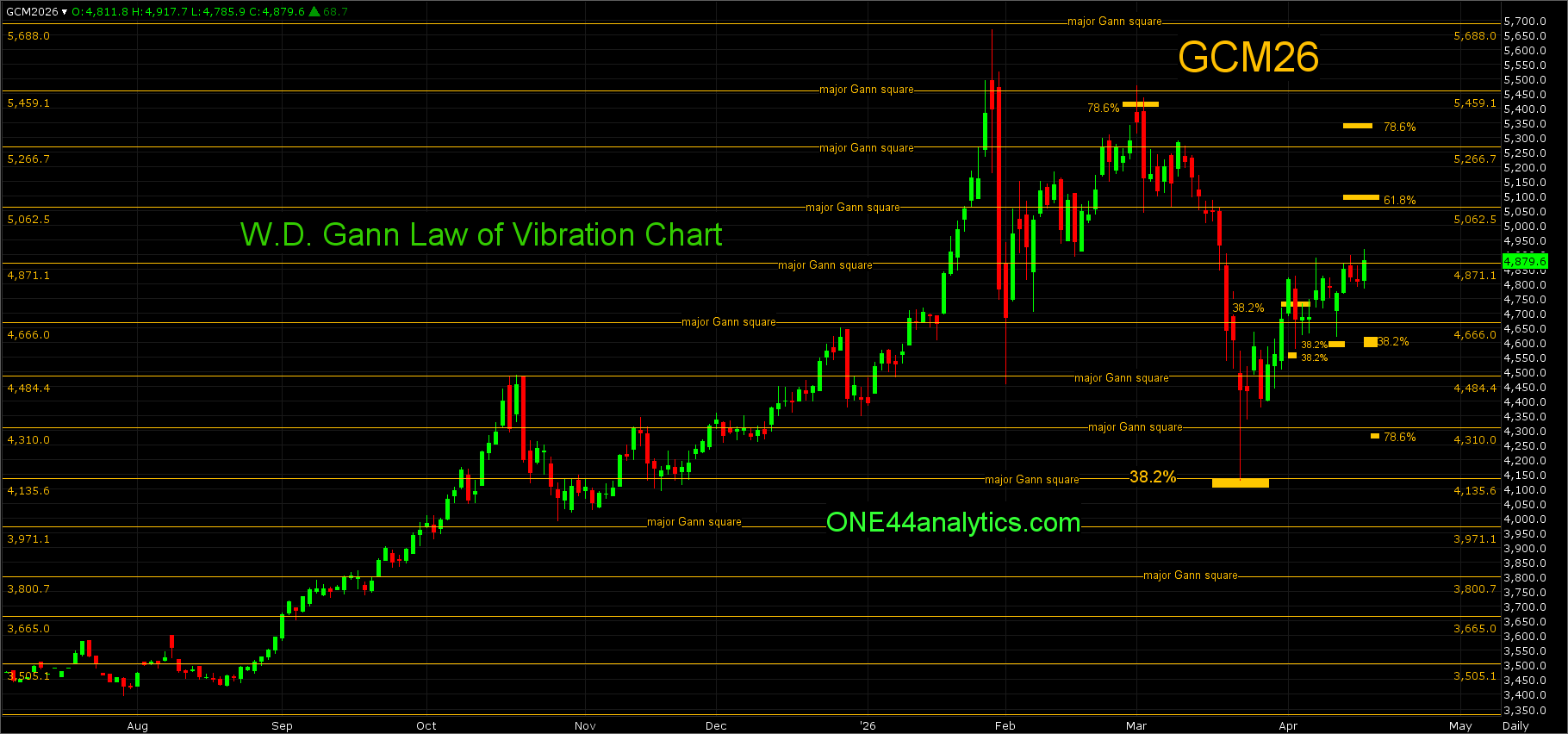 Below it, the short term target is 38.2% back to the 3/23/26 low at 4619.00, holding this level keeps the short term trend extremely positive and a new high can follow (ONE44 38.2% rule). The longer term target area is the 4310.00 major Gann square and 78.6% of the same move at 4290.00.